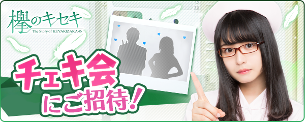 「チェキ会確定券」の入手、もしくは「チェキ会抽選券」の抽選に当選すると、欅坂46メンバーとチェキを撮ることができるリアルイベント「チェキ会」にご招待いたします。詳細はゲーム内のお知らせをご覧ください。